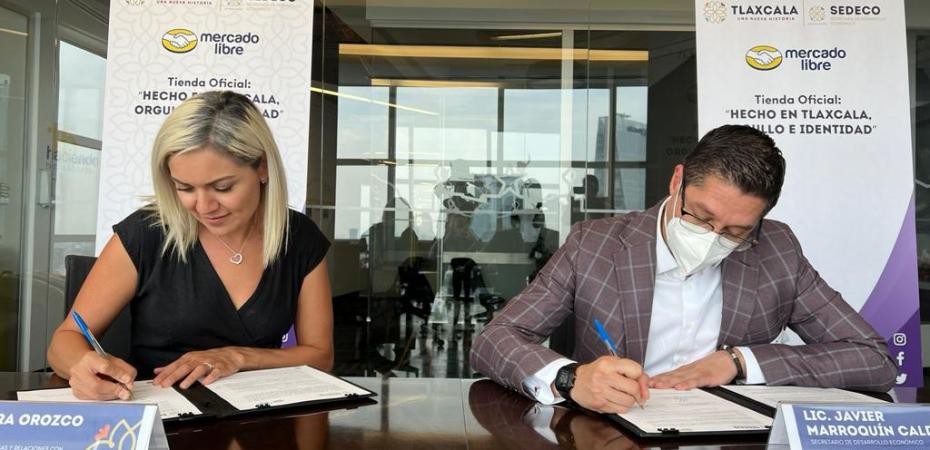 En las instalaciones de Mercado Libre en Ciudad de México, el secretario de Desarrollo Económico, Javier Marroquín Calderón y la directora de Políticas Públicas y Relaciones con Gobierno de Mercado Libre, Alehira Orozco Reyes, firmaron el acuerdo que tiene como objetivo que quienes elaboran productos tlaxcaltecas puedan ampliar su exposición y ventas a nivel nacional e internacional.