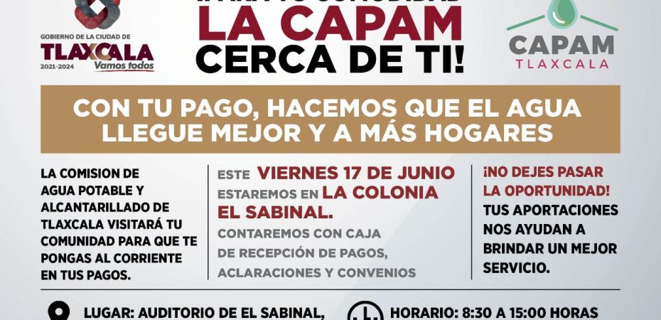 - Este viernes 17 de junio “CAPAM cerca de ti” visitará la colonia El Sabinal para recibir pagos, aclaraciones y celebrar convenios con los usuarios