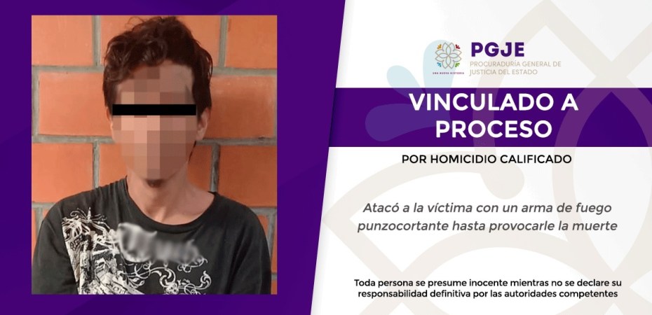 La Procuraduría General de Justicia del Estado (PGJE) informa de la vinculación a proceso de un hombre por el delito de homicidio calificado que se perpetró en la población de San Diego Xocoyucan, municipio de Ixtacuixtla, judicializándose la carpeta de investigación para ser llevada ante un juez y pasar a la siguiente fase de investigación.