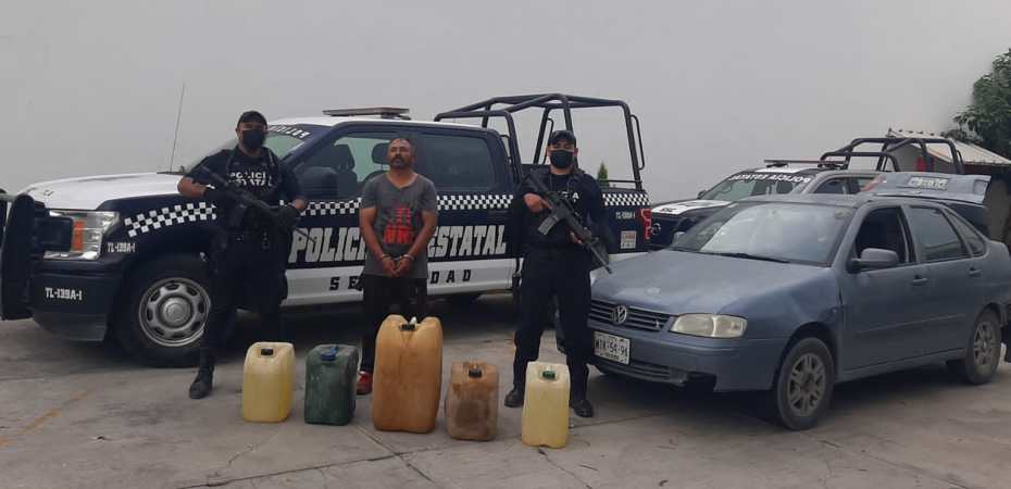 Elementos de la Secretaría de Seguridad Ciudadana (SSC) aseguraron a una persona por el delito de posesión y transporte de hidrocarburo en el municipio de Atltzayanca.