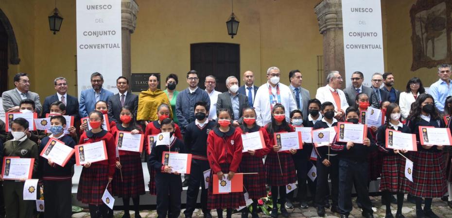 Al finalizar el acto protocolario, alumnas y alumnos de diversas instituciones de educación básica de la capital, fueron reconocidos por el CONSAFRAN como Custodios Infantiles Honoríficos del Patrimonio Cultural.
