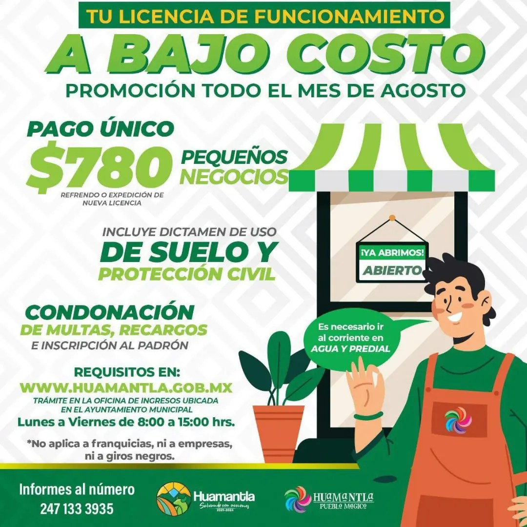 Para impulsar el desarrollo de los comerciantes de Huamantla, el gobierno municipal que preside Salvador Santos Cedillo, lleva a cabo la campaña de regularización de licencias de funcionamiento a bajo costo durante el mes de agosto.