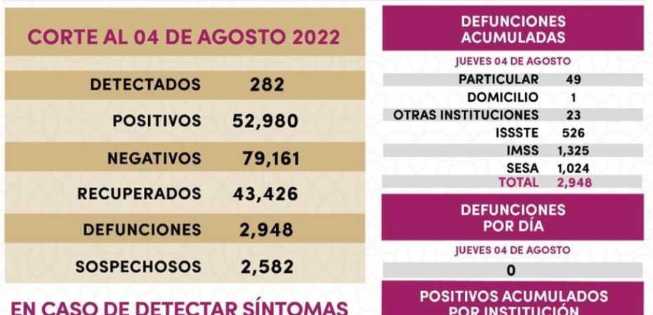 Los datos de la SESA registrados en la plataforma nacional del Sistema de Vigilancia Epidemiológica de Enfermedades Respiratorias (Sisver), confirmaron 282 casos positivos de Covid-19 y cero defunciones, el 4 de agosto de 2022 en la entidad.