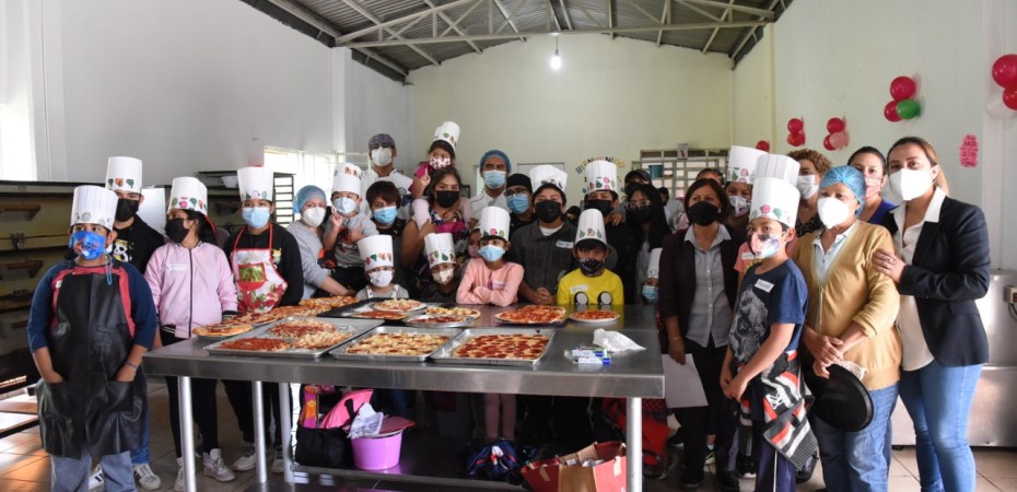 En su primera clase, los pequeños aprendieron a elaborar mini pizzas en compañía de la presidenta honorífica del DIF Municipal, Cecilia Herrejón
