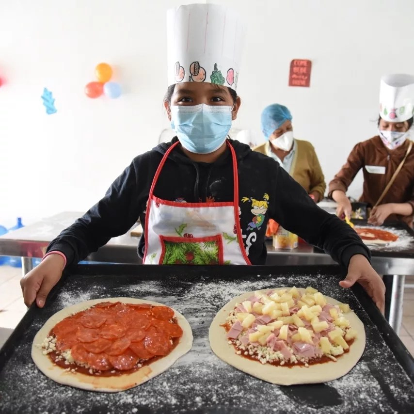 Acompañados de la presidenta honorífica del DIF Municipal, Cecilia Herrejón, los infantes aprendieron a preparar masa para pizza y a condimentarla con sus ingredientes favoritos, en un ambiente divertido.