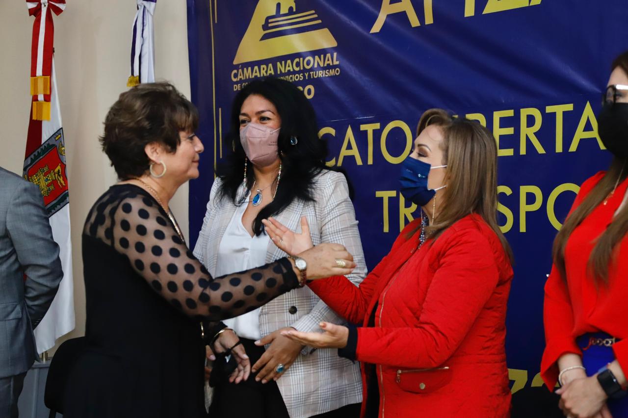 La gobernadora Lorena Cuéllar estuvo acompañada por las presidentas de la Mesa Directiva de la Comisión Permanente del Congreso local, Reyna Flores Báez Lozano y del Tribunal Superior de Justicia del Estado (TSJE), Mary Cruz Cortés Ornelas; de la dirigente de la Canaco Apizaco, Yolanda Domínguez Vázquez y de los secretarios de Desarrollo Económico, Javier Marroquín Calderón y de Infraestructura, Alfonso Sánchez García.
