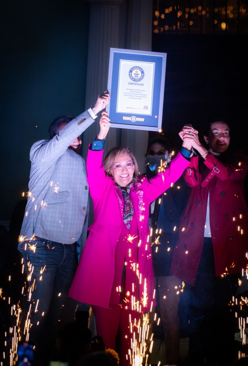 La gobernadora Lorena Cuéllar Cisneros recibió constancia del Récord Guinness por el tapete de aserrín más largo del mundo realizado en Huamantla, en el marco de “La noche que nadie duerme”, como parte de los festejos a la Virgen de la Caridad.