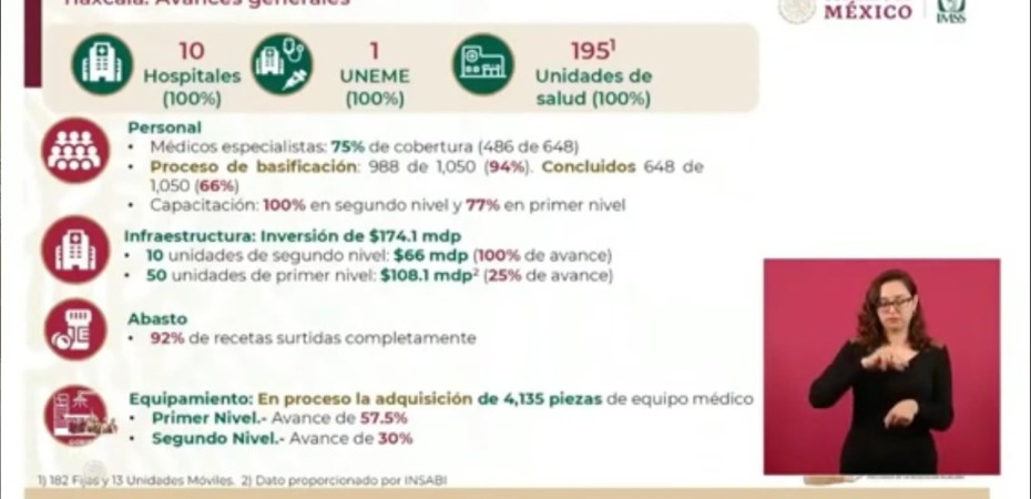 Robledo Aburto indicó que en Tlaxcala el IMSS-Bienestar tiene presencia en el 100 por ciento de unidades en 10 hospitales, una Unidad de Especialidad Médica -la UNEME de Detección y Diagnóstico de Cáncer de Mama- y 195 centros de salud, con una cobertura de médicos especialistas del 75 por ciento en todos los turnos.