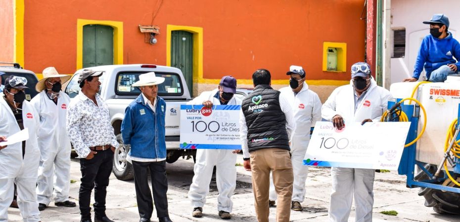 Con la finalidad de que las plagas de chapulines no afecten las cosechas, el alcalde de Apizaco, Pablo Badillo, encabezó la entrega de 500 litros de diésel para tractores, con los que dio inicio la fumigación, beneficiando a más de 400 productores de Santa María Texcalac