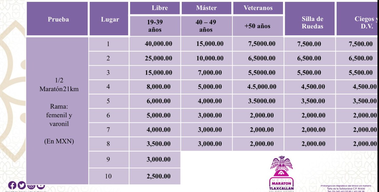 Como parte de esta fiesta deportiva, se entregará un estímulo de 10 mil pesos a la primera mujer y hombre tlaxcaltecas que crucen la meta en la prueba de Medio Maratón, requisito que deberá acreditarse como persona nacida en la entidad.