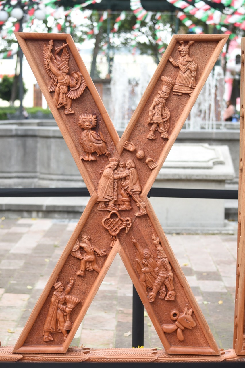 En la tercera letra, destaca la figura del dios de la guerra Camaxtli y algunos pasajes de las guerras floridas tlaxcaltecas. En la letra “X”, se encuentra la representación de los antiguos guerreros tlaxcaltecas y finalmente se plasma el encuentro de dos culturas, en las figuras de Hernán Cortes y la Malinche.