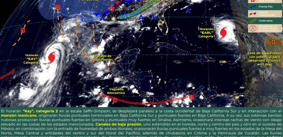 El Servicio Meteorológico Nacional (SMN) y la Comisión Nacional del Agua (Conagua), por medio de la Coordinación Estatal de Protección Civil (CEPC), informan que este miércoles el estado de Tlaxcala se verá afectado por la presencia del huracán “Kay”, categoría dos en la escala Saffir-Simpson, que se desplaza paralelo a la costa occidental de Baja California Sur y en interacción con el monzón mexicano.