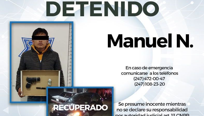 Por las acciones antes mencionadas, fue detenido Manuel N. de 21 años de edad, a quien también se le encontró una arma de fuego entre sus pertenencias; fue así que, después de leerle sus derechos de Ley fue trasladado a la Comisaría Municipal para ser puesto a disposición de la autoridad correspondiente quien determinará su situación legal.