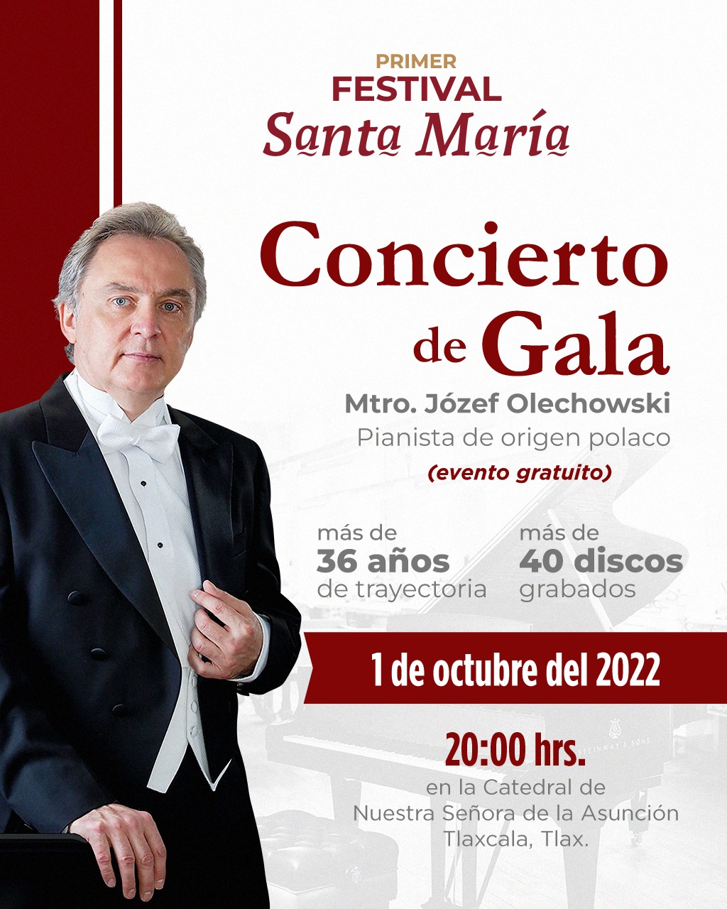Józef Olechowski, pianista de origen polaco con una trayectoria de cuatro décadas y más de 40 discos grabados, presentará su más reciente material en el Concierto de Gala que tendrá lugar en el atrio de la Catedral de Nuestra Señora de la Asunción, este 1 de octubre en punto de las 20:00 horas.