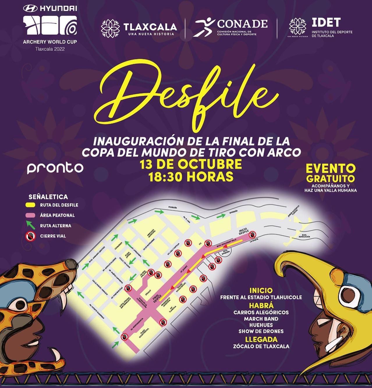 Las actividades de la justa deportiva internacional comenzarán el día de hoy con el desfile del Mundial de Tiro con Arco, que partirá del Estadio Tlahuicole a las 18:30 horas, y recorrerá las calles Guillermo Valle y Avenida Independencia, que cerrarán su circulación a partir de las 17:00 horas.