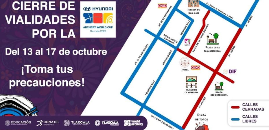 El Ayuntamiento de Tlaxcala informa a la ciudadanía acerca de los cierres viales que se realizarán a partir de este jueves y durante todo el fin de semana, con motivo del Mundial de Tiro con Arco.
