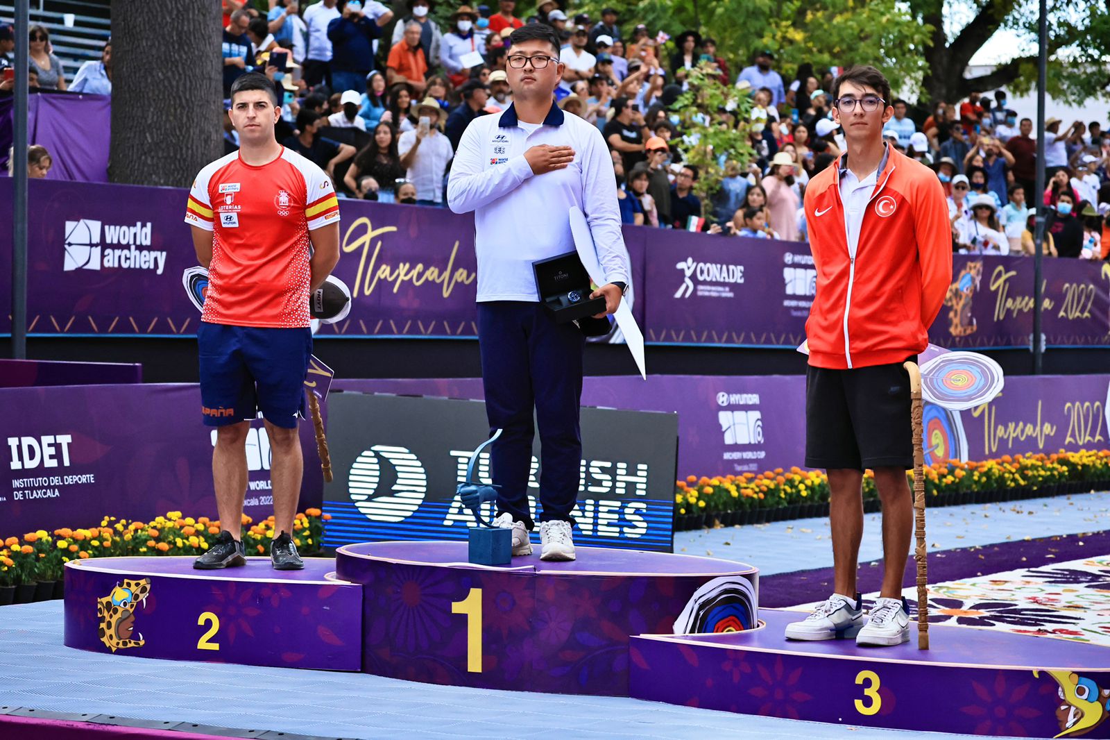 La titular del Ejecutivo local presenció la última competencia de la copa, en la categoría de arco recurvo varonil, de la cual resultaron ganadores el coreano Kim Woojin con oro, el español Miguel Alvariño García y el turco Mete Gazoz, plata y bronce, respectivamente.