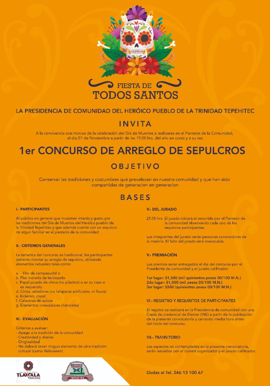 Las actividades para conmemorar a nuestros muertos tienen especial significado en los panteones. En este marco la presidencia de comunidad del heroico pueblo de La Trinidad Tepehitec invita al primer Concurso de Arreglo de Sepulcros.