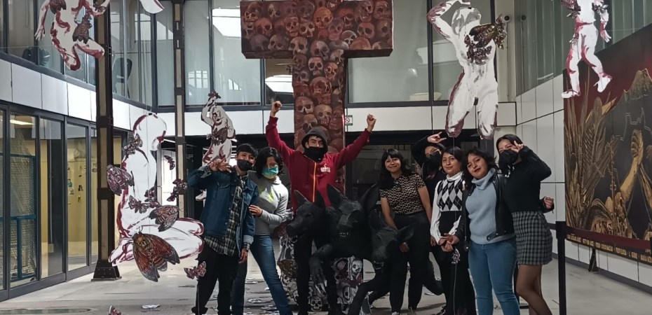 Estudiantes de la Escuela de Arte de Tlaxcala (Edart) realizaron la obra titulada “México, Violencia y Muerte”, la cual es una instalación pictográfica que refleja la inseguridad; compuesta por ocho piezas en las que destacan una cruz, un perro de tres cabezas, así como figuras humanas, polillas y cráneos.
