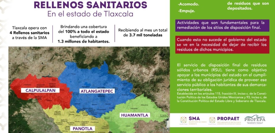 La Secretaría de Medio Ambiente (SMA) notificó a los ayuntamientos de Apizaco, Huamantla, Panotla y Zacatelco que los rellenos sanitarios operados por el Gobierno del Estado de Tlaxcala, dejarán de recibir los Residuos Sólidos Urbanos (RSU) debido a que han pasado 11 meses sin el pago de derechos causados por la prestación de ese servicio.