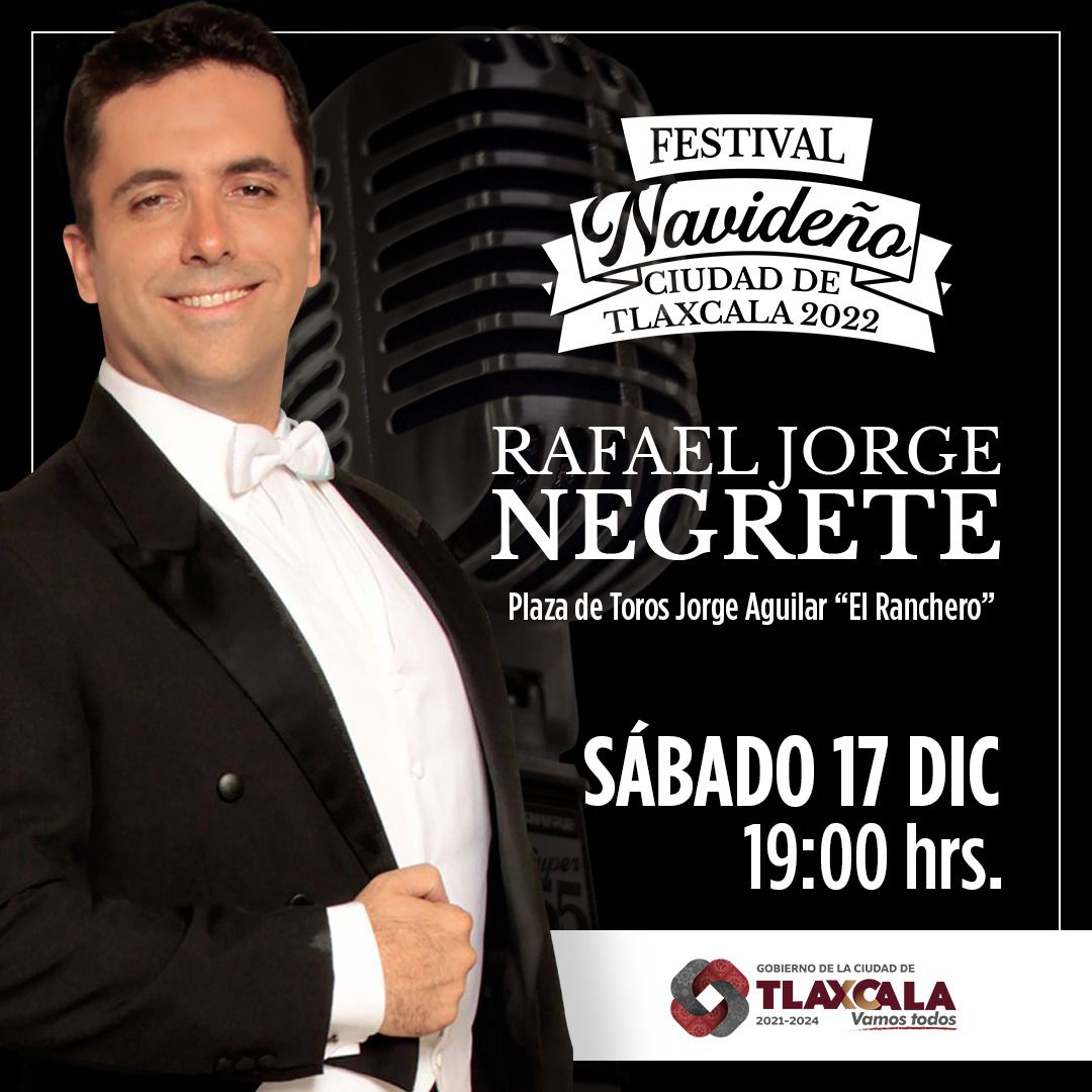 El día sábado 17 de diciembre a las 19:00 horas escucharemos al barítono Rafael Jorge Negrete, que deleitará al público asistente con piezas de afamadas óperas y obras sinfónicas. El nieto de Jorge Negrete cantará a la Navidad de Tlaxcala Capital.