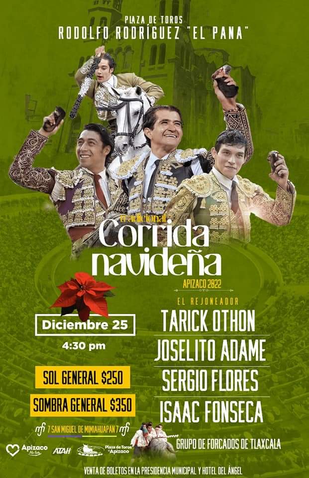 Tarik Othon (Rej) acompañado de los Forcados de Tlaxcala, Josélito Adame, Sergio Flores e Isacc Fonseca para lidiar 7 Toros de San Miguel de Mimihuapan a las 4:30 de la tarde.