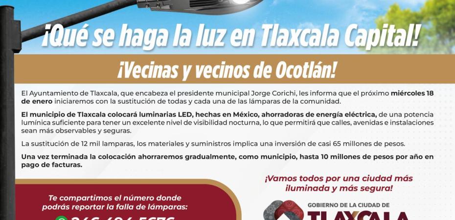 El Ayuntamiento de Tlaxcala, que encabeza el presidente municipal Jorge Corichi, inicia este miércoles 18 de enero la sustitución de 12 mil lámparas ubicadas en las 11 comunidades, siete delegaciones y zona centro.