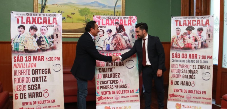 El presidente municipal de Tlaxcala, Jorge Corichi, y el director operativo de la empresa Feria Toro, Othón Ortega Salinas, develaron las combinaciones de lo que será el resto del serial taurino que inicia este sábado 28 de enero en la emblemática Plaza de Toros Jorge Aguilar, “El Ranchero”.