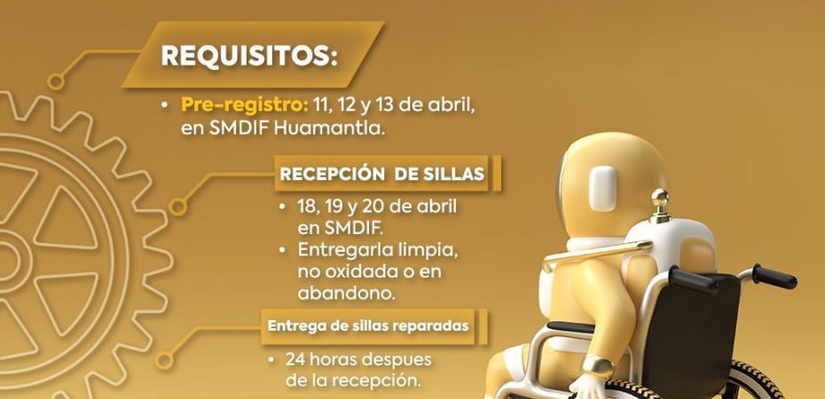 Por su parte, Karla Guadalupe Menéndez Cedillo, presidenta honorífica del DIF Huamantla, informa que el pre-registro será el 11, 12 y 13 de abril; y la recepción de las sillas se llevará a cabo del 18 al 20 de abril, y en un tiempo aproximado de 24 horas sea entregada en mejores condiciones para su uso.