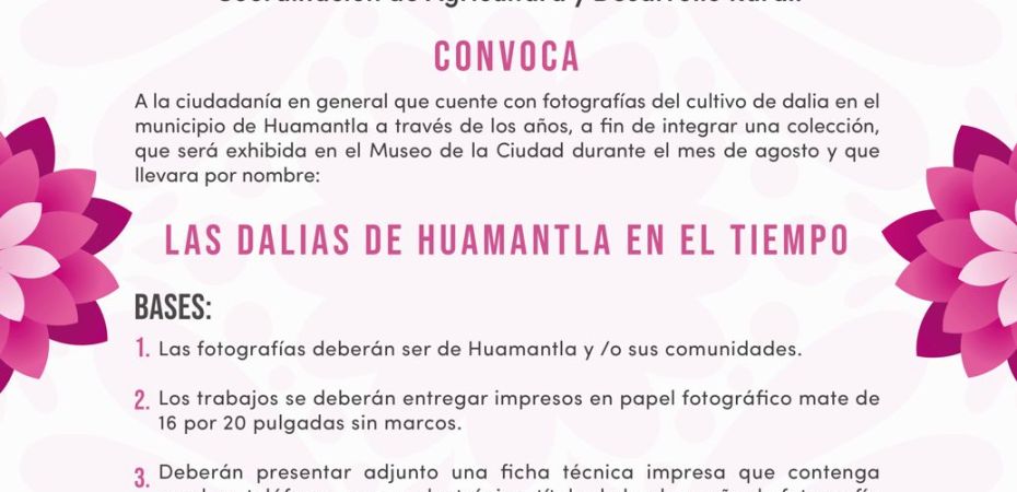 Con el objetivo de integrar una colección histórica de fotografías del cultivo de la dalia en el Pueblo Mágico, el Ayuntamiento de Huamantla a través de la Coordinación de Agricultura y Desarrollo Rural, invita a la ciudadanía a participar en la exposición “Las Dalias de Huamantla en el Tiempo”, que será exhibida en el Museo de la Ciudad durante el mes de agosto.