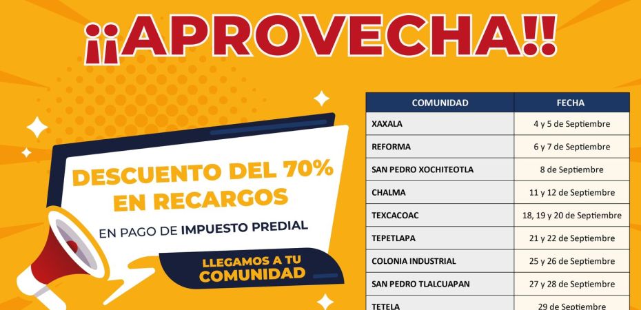 El Ayuntamiento de Chiautempan a través de la Tesorería Municipal, anunció la puesta en marcha de la Caja Itinerante para pago del impuesto predial, la cual, visitará todas las comunidades, colonias y barrios del municipio con una oferta del 70 por ciento de descuento en recargos en un horario de las 10:00 a las 17:00 horas, dependiendo la comunidad.