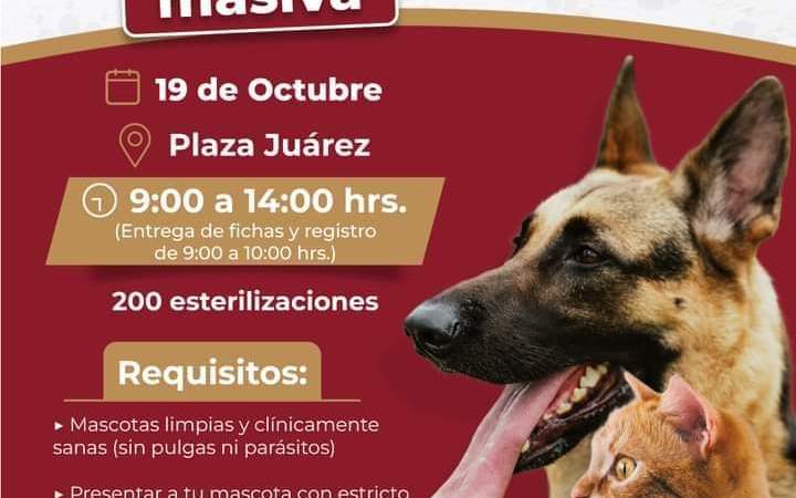 Este jueves 19 de octubre en la Plaza Juárez de Tlaxcala Capital, el Ayuntamiento que encabeza, la presidenta, Maribel Pérez Arenas, realiza jornada masiva de esterilización de Caninos y Felinos.