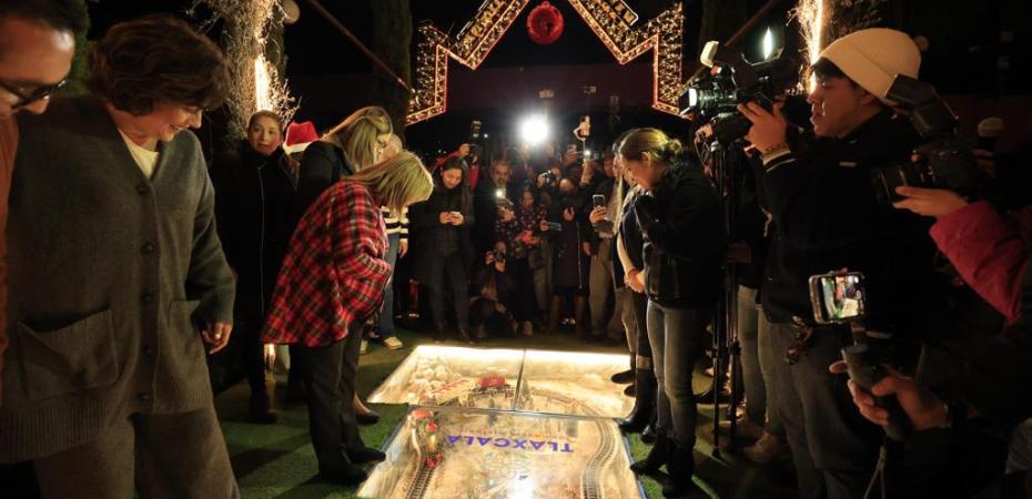 La gobernadora del estado, Lorena Cuéllar Cisneros, acompañada de la presidenta ejecutiva del patronato para las Exposiciones y Ferias en la Ciudad de Tlaxcala, Rosa Elena Nava García Méndez, inauguró y realizó el encendido oficial de la Villa Navideña Tlaxcala 2023 en el recinto ferial.