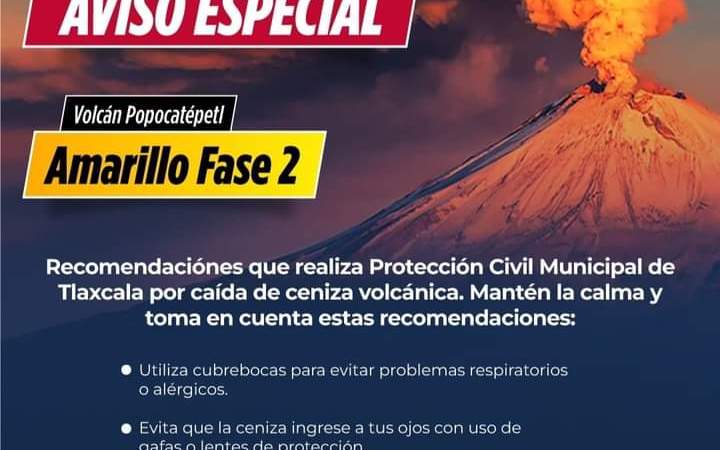 El Ayuntamiento de Tlaxcala, a través de la Coordinación de Protección Civil emitió una serie de recomendaciones ante el incremento de actividad del Volcán Popocatépetl.
