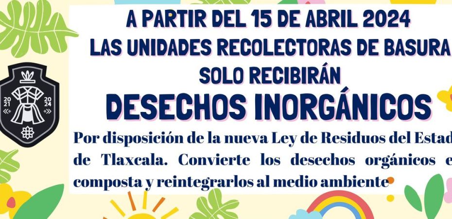 A partir del 15 de abril, el Ayuntamiento de Yauhquemehcan, se adhiere a la aplicación de la nueva disposición estatal, para la recolección de desechos, por lo qué se les invita a los ciudadanos la separación de los residuos desde casa, ya que solo se estará recibiendo en los camiones recolectores los que están inorgánicos.