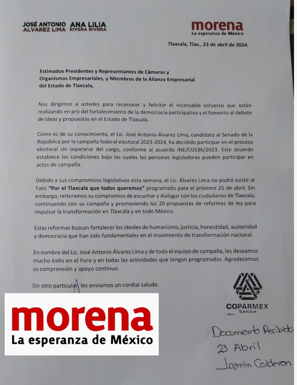 El candidato a Senador de la coalición Movimiento de Regeneración Nacional, José Antonio Álvarez Lima, por medio de un oficio, dirigido a los Presidentes y Representantes de la cámara de Organismos Empresariales y Miembros de la Alianza Empresarial del Estado de Tlaxcala, informo que debido a sus compromisos legislativos no asistirá al foro “Por el Tlaxcala que todos queremos”.