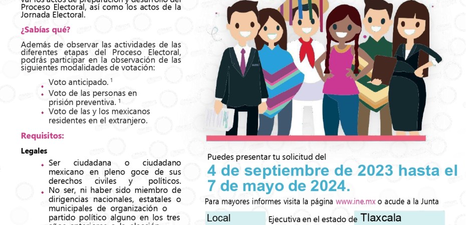 El Instituto Nacional Electoral (INE) en Tlaxcala hizo un llamado urgente a la ciudadanía tlaxcalteca a ser observadora u observador del Proceso Electoral Concurrente 2023-2024, ya que el plazo para el registro de aspirantes vence este 7 de mayo.