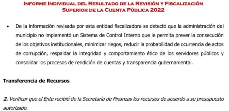 “Del Fondo de Ingresos y Participaciones Económicas, de un presupuesto recibido de $21,750,030.30, devengaron $21,208,010.62 y un remanente del periodo por $9,670.79 dando un total de $21,217,681.41; y de la revisión a la cuenta pública, auditoría financiera y de obra pública; se determinó un probable daño a la Hacienda Pública por $2,090,368.32, que comprende irregularidades entre otras, gastos pagados sin documentación comprobatoria pago a empresas que no justifican operaciones comerciales, pago a proveedore prestadores de servicios y/o contratistas sin acreditar la recepción del bien o servicio pagos improcedentes, pago de gastos en exceso, pago de bienes y/o servicios si acreditar su recepción y/o aplicación, recursos públicos faltantes, recursos público otorgados no comprobados.” Así lo señala el dictamen del año 2022.