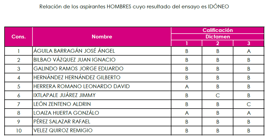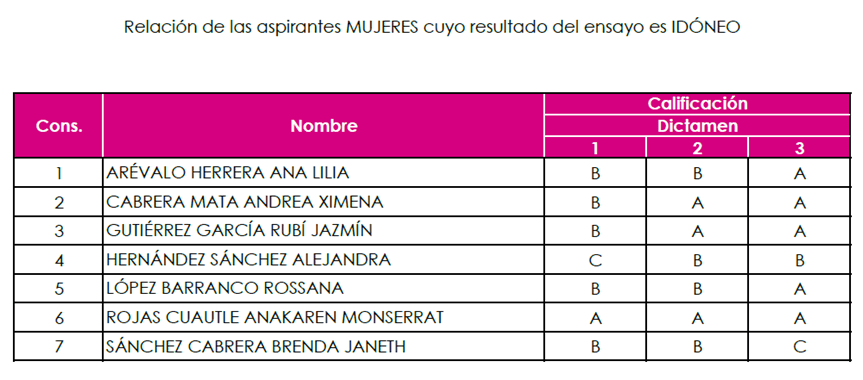 Las y los aspirantes que obtuvieron idóneo en los ensayos presentados son: