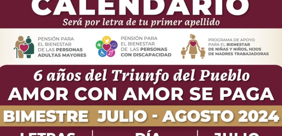 Explicó que para el bimestre julio-agosto, derechohabientes y beneficiarios recibirán pensión o programa a través de depósito bancario del 1° al 19 de julio; para brindar mejor atención a derechohabientes, el depósito bancario se realizará de acuerdo con la letra inicial del primer apellido, por lo que no es necesario acudir antes de la fecha programada, ya que el recurso estará disponible a partir del día señalado en el siguiente calendario: