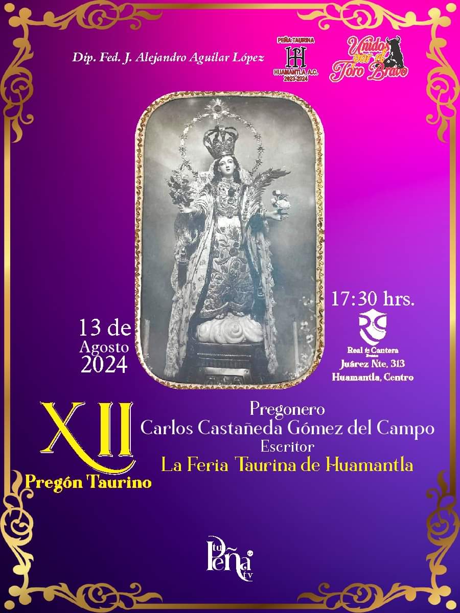 El Diputado Federal José Alejandro Aguilar López, la Peña Taurina Huamantla A.C., y la Asociación Taurófila «Unidos por el Toro Bravo» invitan la Doceava Edición del Pregón Taurino que versará sobre «La Feria Taurina de Huamantla», esta ocasión será proclamado por el Escritor, ganadero e intelectual Carlos Castañeda Gómez del Campo, el martes 13 de agosto de 2024 en el Salón Real de Cantera, la cita es a las 5:30 pm.