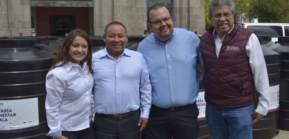 La Licenciada Fernanda Espinosa de los Monteros, Presidenta Honorífica del Comité Consultivo de Bienestar Estatal; el Ingeniero Rubén Espinosa Mejía, Director de Participación Social; el Presidente de Apizaco, Javier Rivera Bonilla, y el Secretario de Ayuntamiento, Juan Pablo Morales Rico; presidieron la entrega de 176 tinacos que beneficiarán a las familias apizaquenses que más lo necesitan para mejorar su calidad de vida.