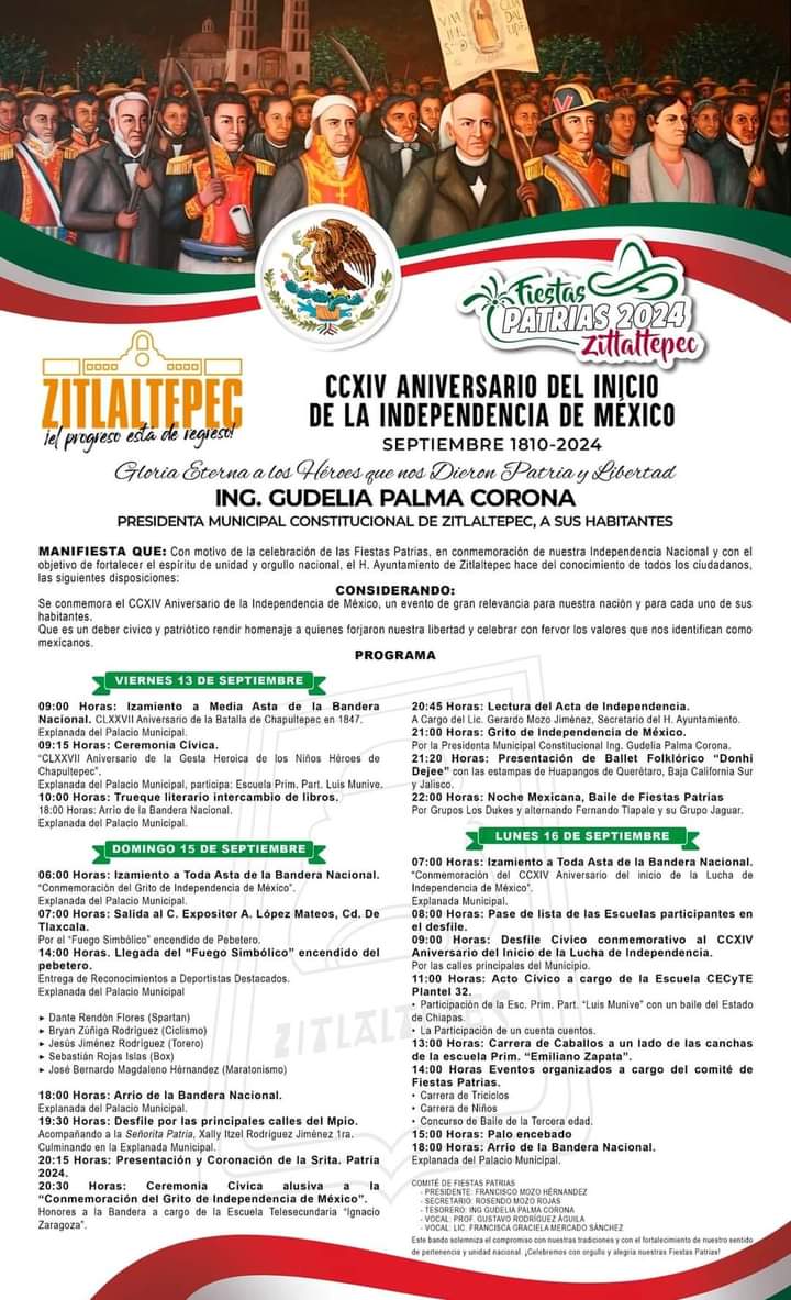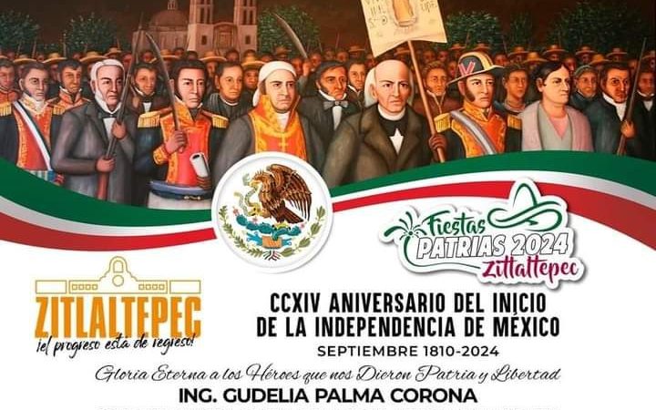 El municipio de Zitlaltepec, que encabeza la presidenta municipal Gudelia Palma Corona, dio a conocer el Bando Solemne de las Fiestas Patrias, en estos dos cientos catorce aniversario del inicio de la Independencia de México, con actos cívicos en días tan importantes como son el 13, 15 y 16 de septiembre.