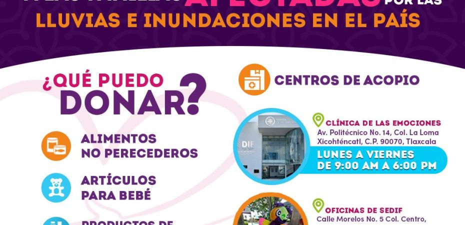 Las donaciones serán enviadas a las familias que más lo necesitan y serán recibidas en las instalaciones de la dependencia, en calle José María Morelos, número 05, en la Colonia Centro de Tlaxcala capital. También en la Clínica de las Emociones, ubicada en avenida Politécnico Nacional, número 14, colonia la Loma Xicohténcatl, así como en los Sistemas Municipales DIF.