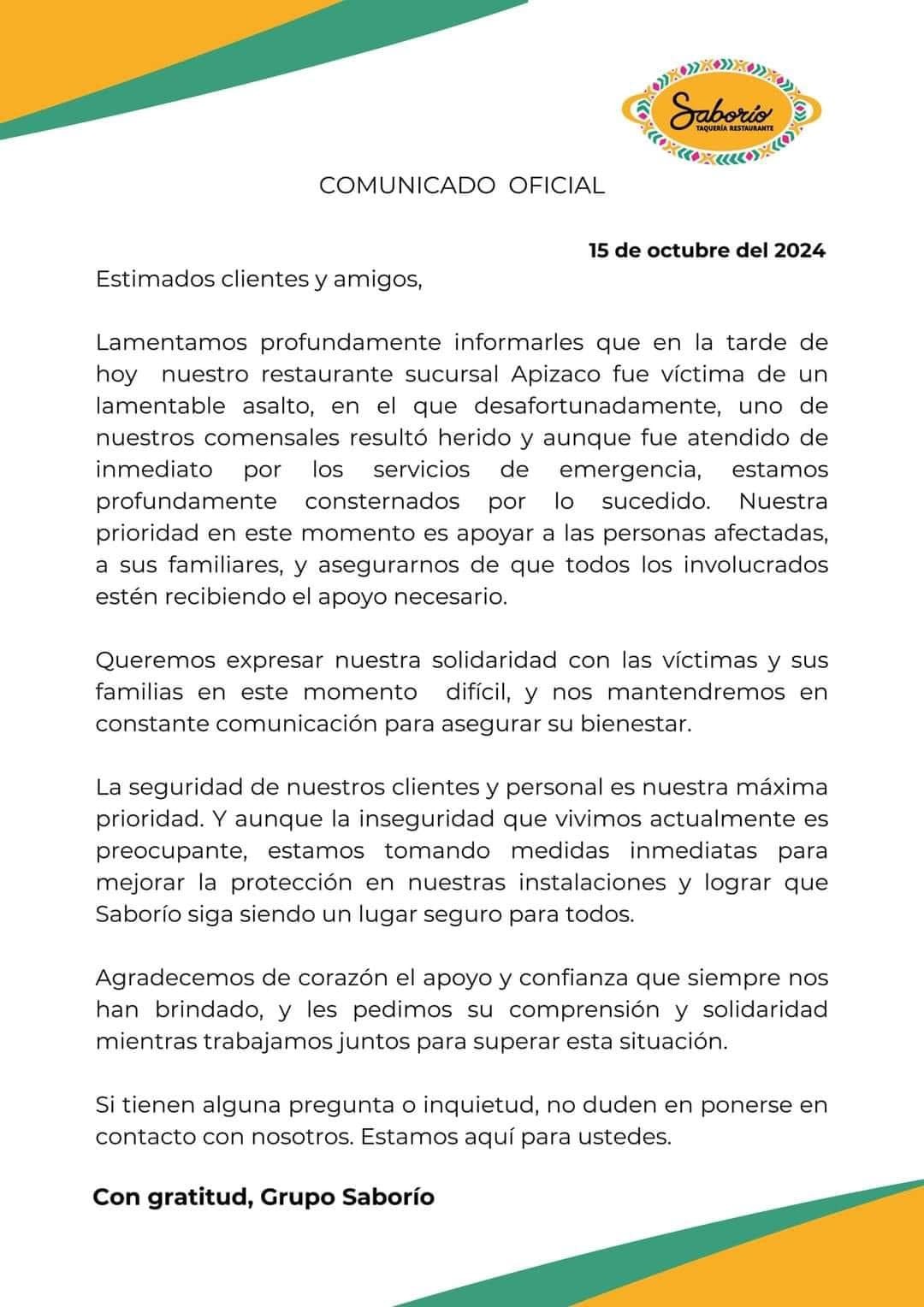 La tarde noche del martes 14 de octubre, en el municipio de Apizaco se registró un asalto a un conocido restaurante ubicado en la Avenida 16 de septiembre, donde al menos 5 sujetos armados asaltaron a comensales del local conocido como El Saborio.