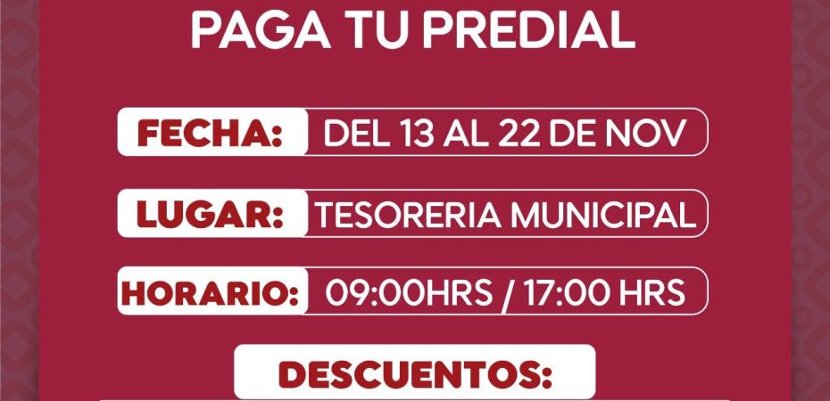Del 13 al 22 de noviembre del año en curso, los apizaquenses podrán ponerse al corriente con sus pagos gracias al descuento del 50 por ciento en multas y recargos y el 10 por ciento de descuento en pago actualizado 2024. La forma de pago podrá realizarse en efectivo o con tarjeta de débito o crédito a meses sin intereses.