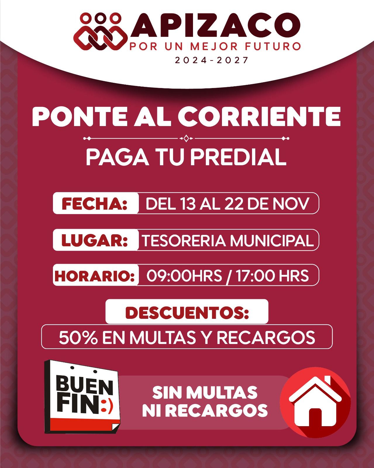 El H. Ayuntamiento de Apizaco encabezado por el alcalde Javier Rivera Bonilla apoya la economía familiar, y con motivo del Buen Fin de este año, invita a todos los ciudadanos a que aprovechen los descuentos en multas y recargos que se ofrecen, para quienes tienen adeudos en pagos del Predial.