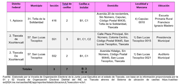 De hecho, añade que, durante el desarrollo de los recorridos de supervisión a las visitas de examinación realizada por los integrantes del Consejo Local y del Instituto Tlaxcalteca de Elecciones (ITE), los lugares propuestos no tuvieron observaciones, pues se constató que garantizan el libre acceso y brindan facilidades a la ciudadanía con algún impedimento físico; cada una de las casillas cumple con los requisitos señalados en el artículo 255 de la Ley General de Instituciones y Procedimientos Electorales (LGIPE) y los aspectos señalados en el artículo 229 del Reglamento de Elecciones (RE). En el informe incluye los domicilios en los que serán ubicadas las casillas: