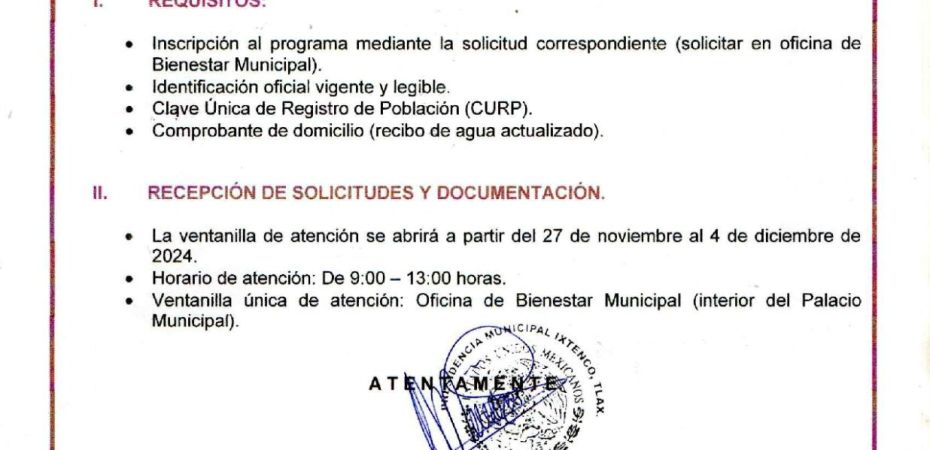 La ventanilla de atención para la recepción de solicitudes y documentación se abrirá a partir del 27 de noviembre y hasta el 4 de diciembre, el horario de atención será de 9 a 13 horas en la ventanilla única de atención: Oficina de Bienestar Municipal (interior del Palacio Municipal).