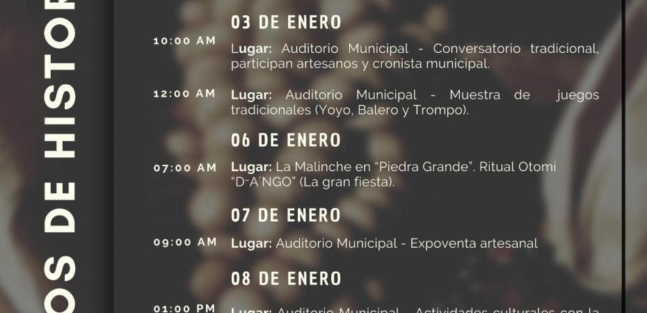 - 03 de enero: Conversatorio tradicional con artesanos y cronista municipal, y muestra de juegos tradicionales en el Auditorio Municipal.